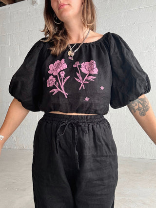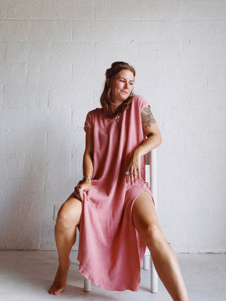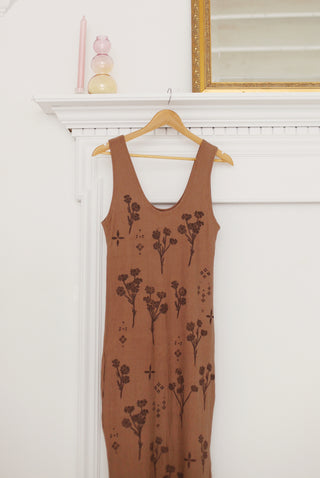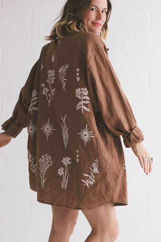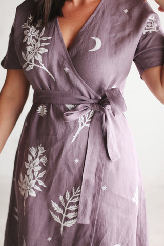 The Wild Rose & Nettle Wrap Dress is a timeless piece, blockprinted by hand on European linen and made to be a pass-me-down heirloom to future daughters.