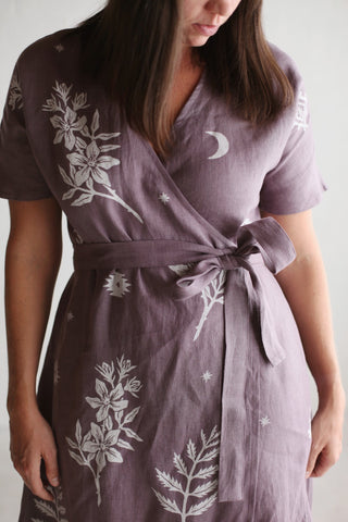 The Wild Rose & Nettle Wrap Dress is a timeless piece, blockprinted by hand on European linen and made to be a pass-me-down heirloom to future daughters.