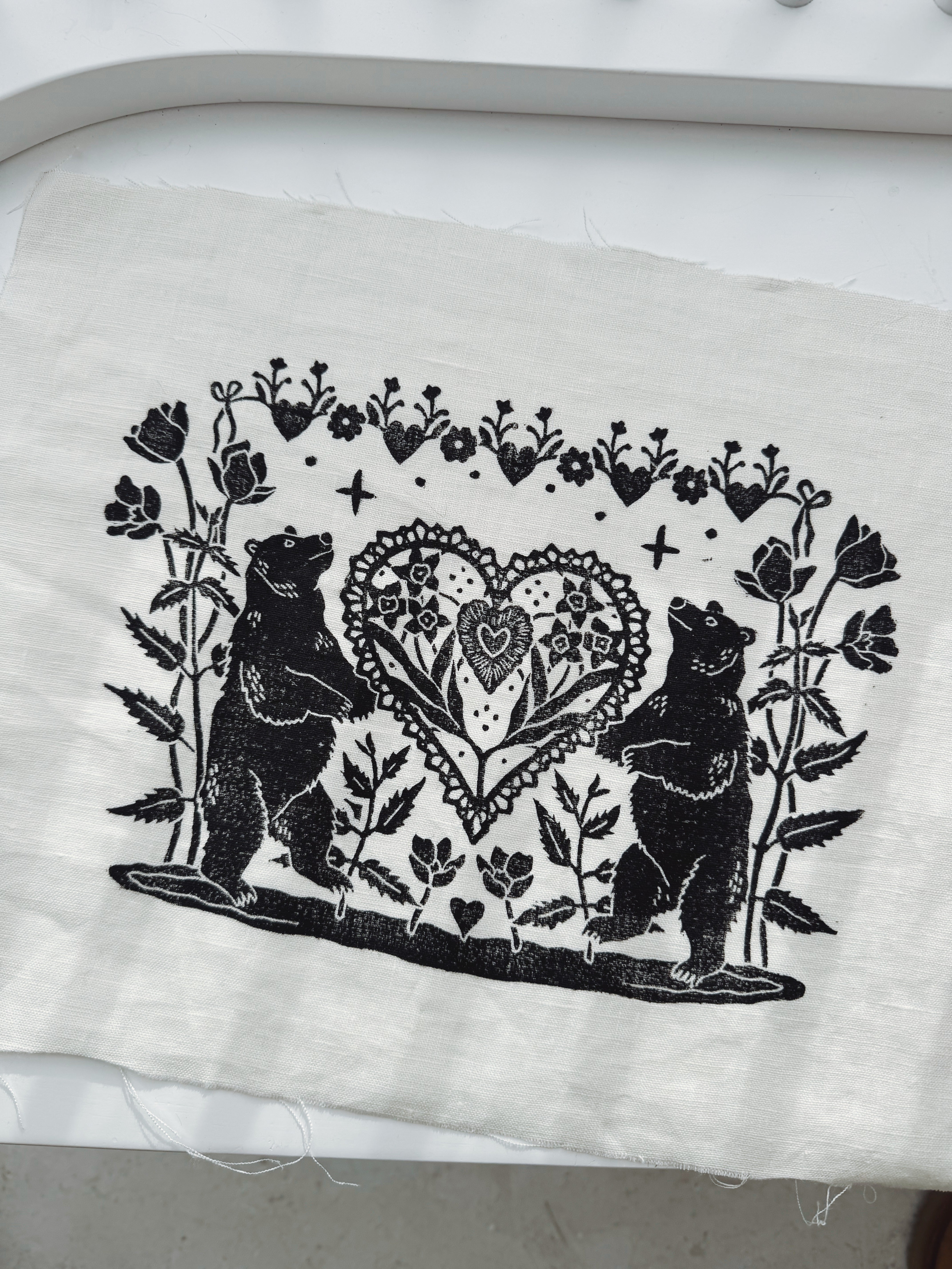 10" x 13" hand-carved block print. Printed on 100% linen. Raw edges are sprayed with a no-fray treatment, but the print should be treated with care and framed or hung. Each print comes with a signed and numbered edition card that can be stored behind the print in a frame. This listing does not include a frame.