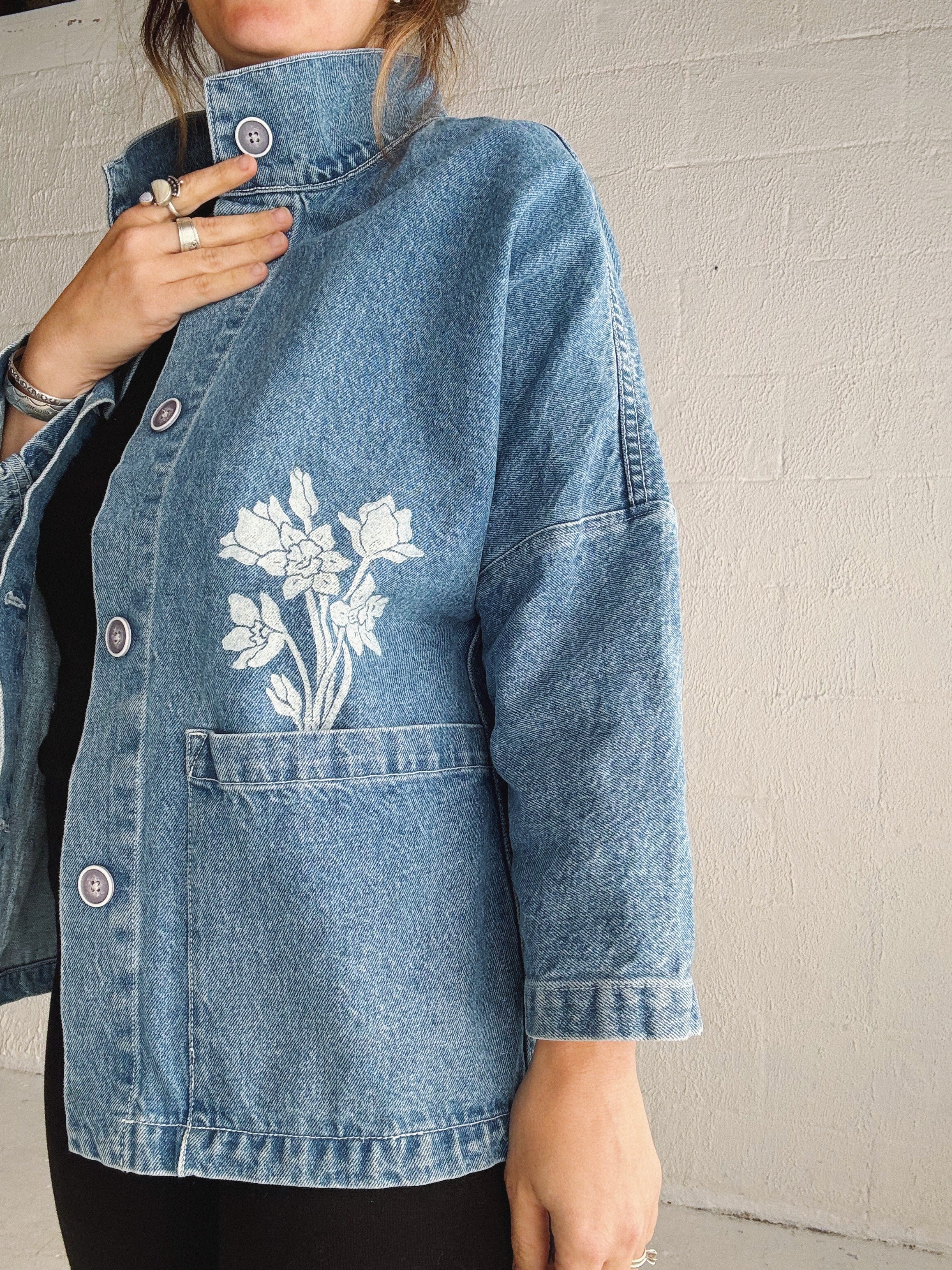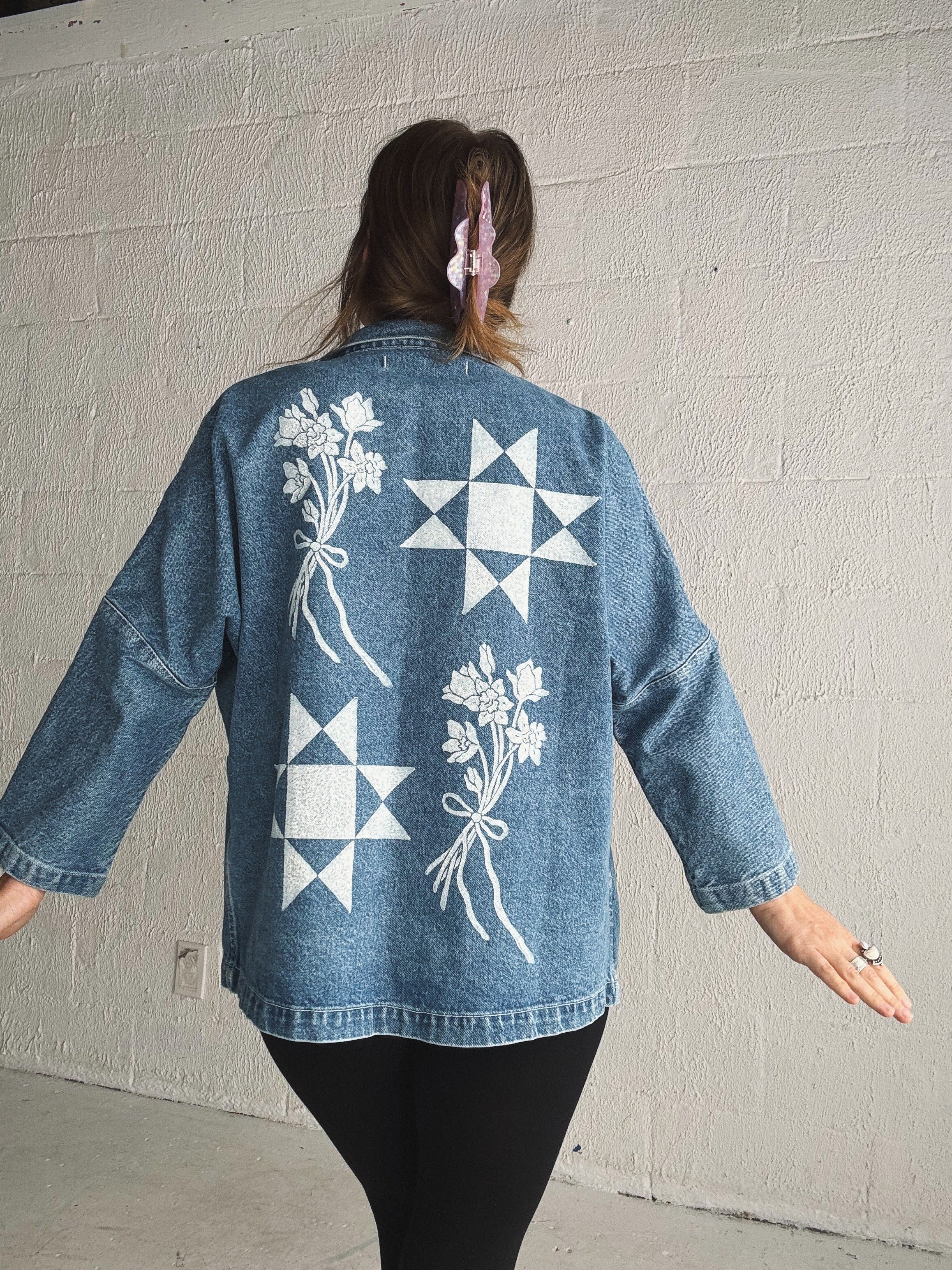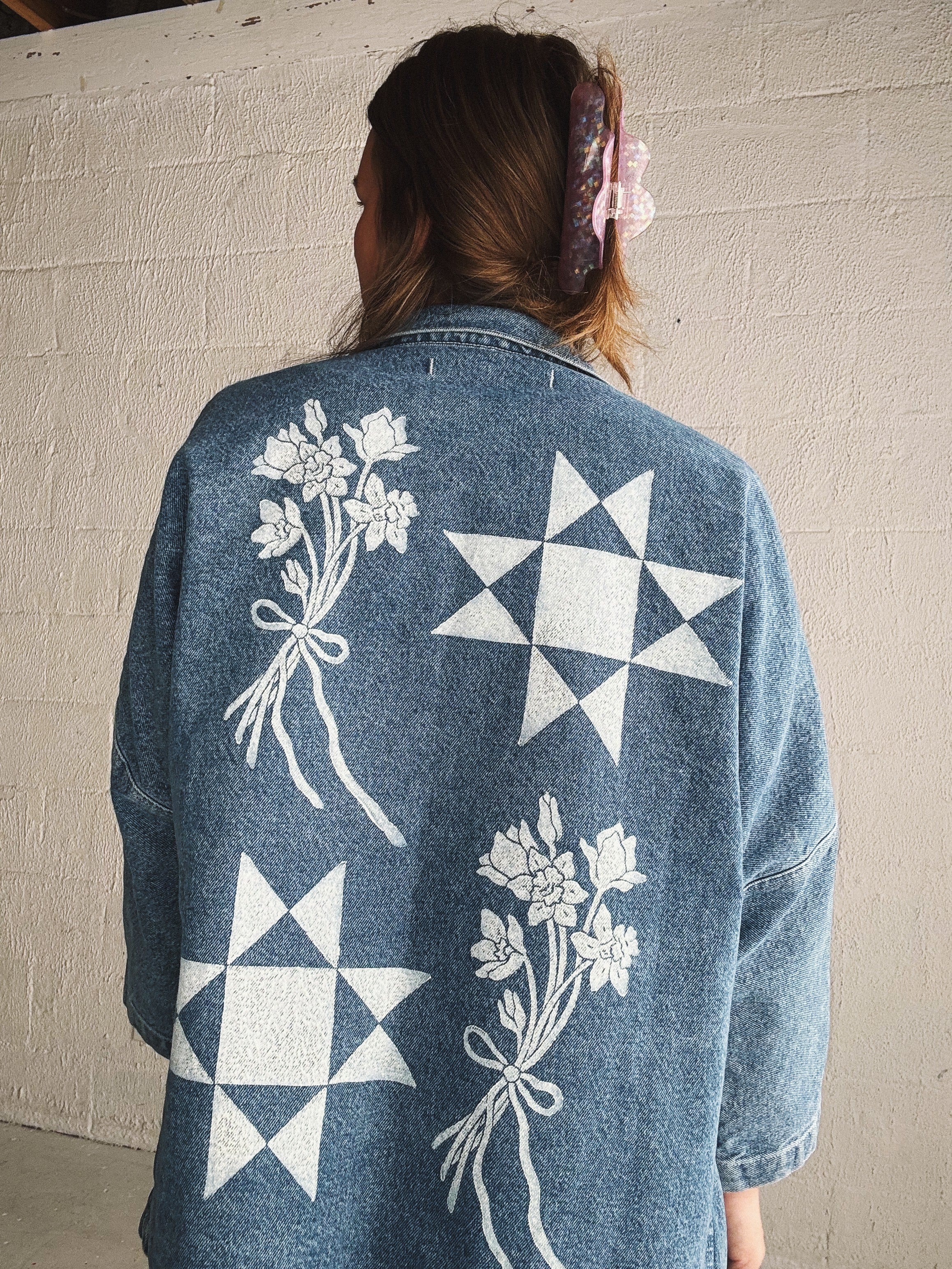 Blockprinted by hand with love on the front & back with Tulip & Daffodil bouquets, and a quilt block.