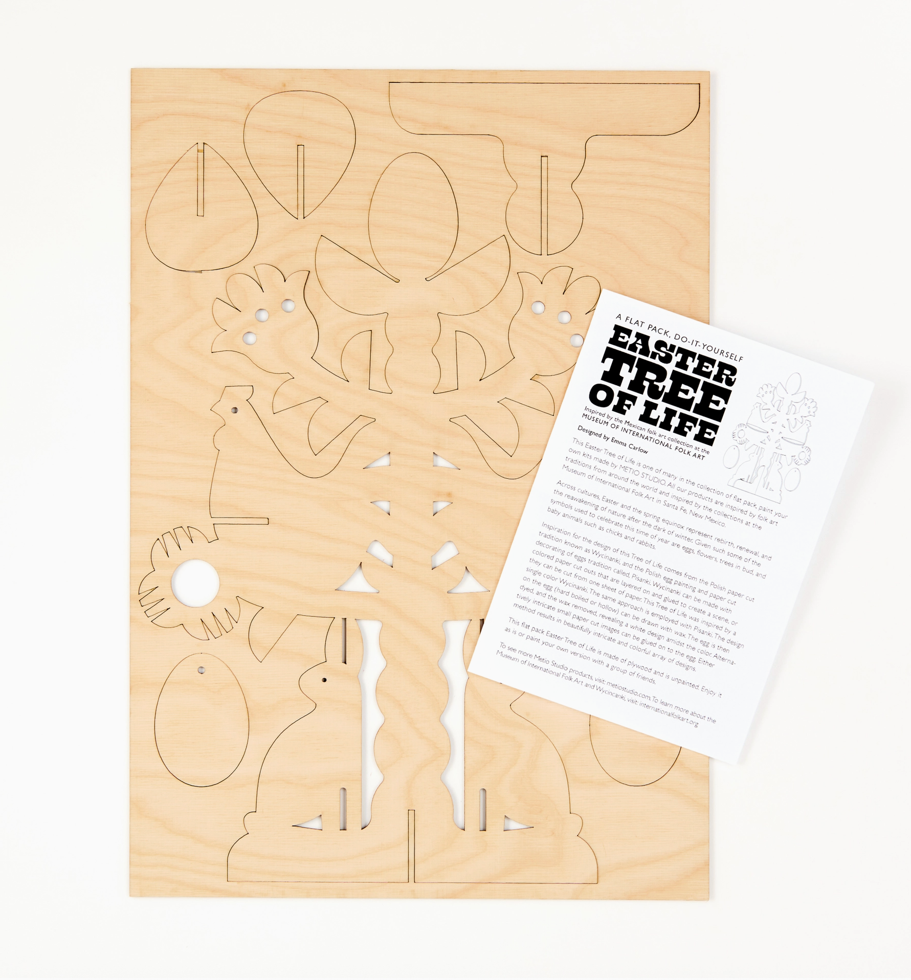 Inspiration for the design of this Tree of Life comes from the Polish paper cut tradition known as Wycinanki, and the egg painting and paper cut decorating tradition called, Pisanki. Wycinanki can be made with colored paper cut outs that are layered on and glued to create a scene, or cut from one sheet of paper. The same approach is employed with Pisanki. The design on the egg (hard boiled or hollow) can be drawn with wax. The egg is then dyed; the wax removed, revealing a white design amidst the color. Dimensions of tree: 15" tall.